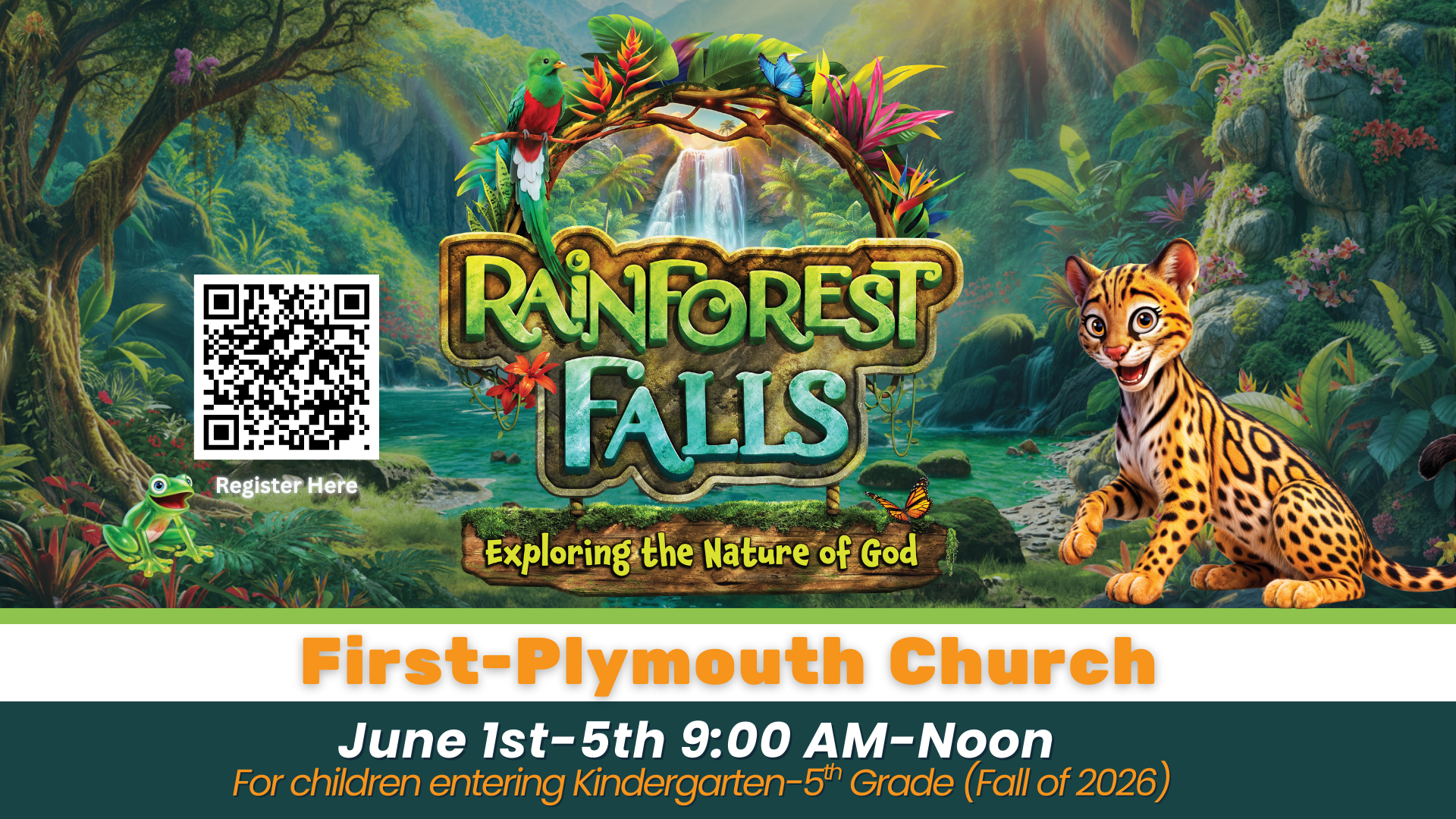 Get ready to head deep into the jungle! At Rainforest Falls, kids will explore a vibrant world of waterfalls, wildlife, and adventure while discovering who God is—through Bible stories, music, and hands-on activities.